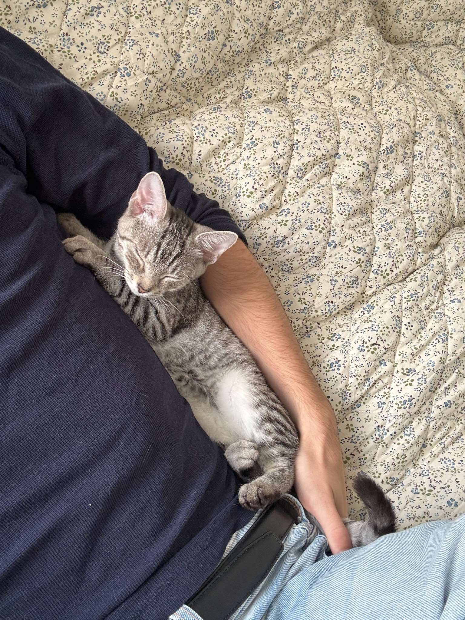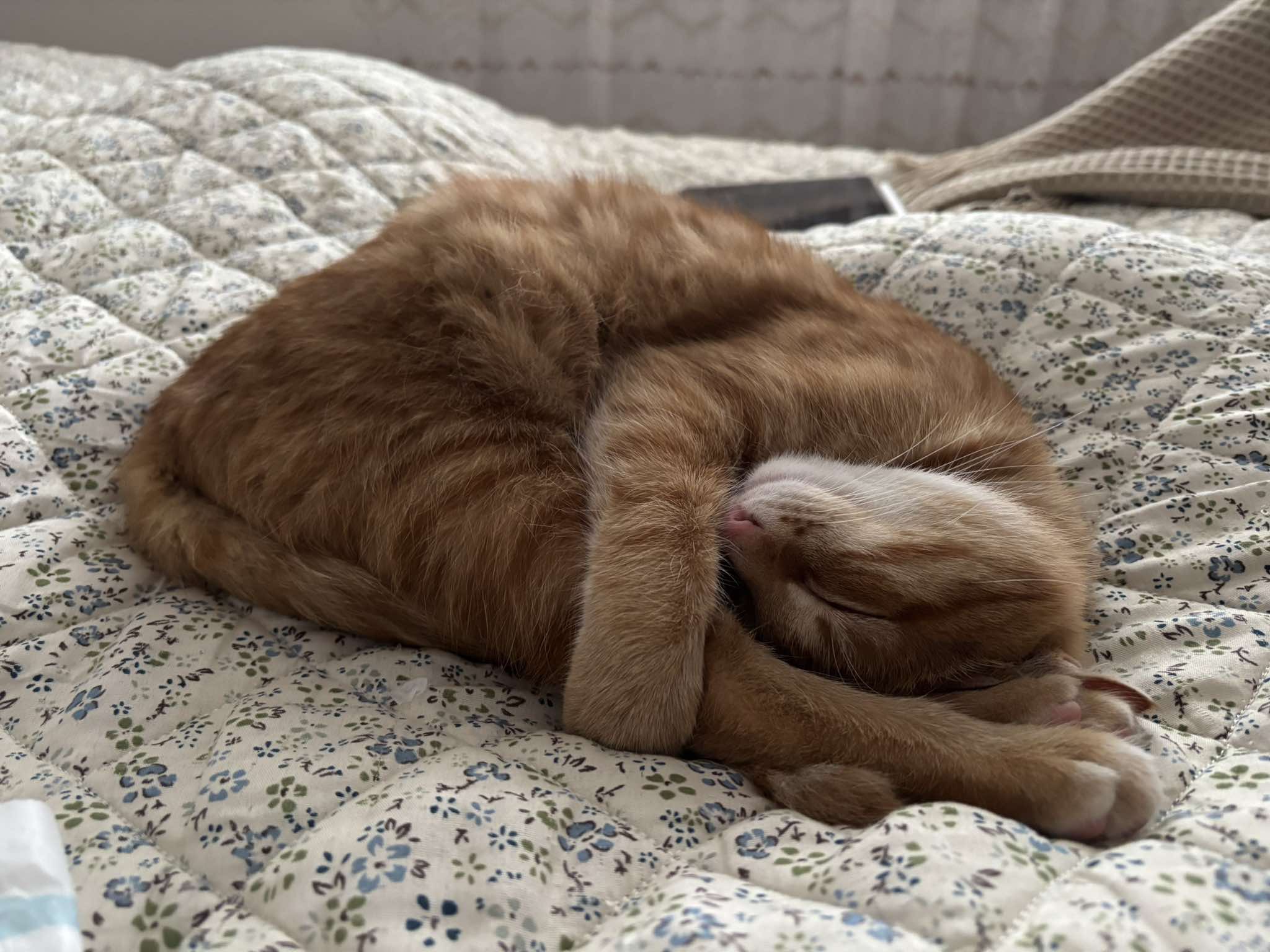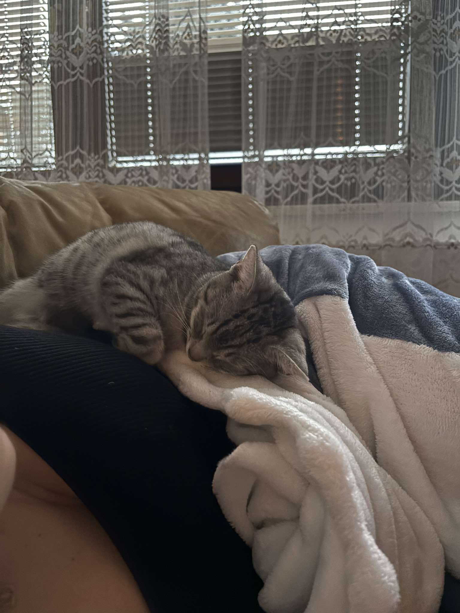 Kocourek, kterého jsme pojmenovali Vendelín, byl od první chvíle velmi mazlivý a to nás velmi překvapilo vzhledem k jeho smutnému příběhu. Venda měl pár trápení po úrazu pánve ale vše skvěle zvládl a nemá už žádné viditelné následky🫶🏻. Je to pořádný neposeda, loví vše co se pohne a snaží se zbaštit každý drobek který potká😋. S Amálkou jsou parťáci v každé lumpárně která je napadne. Každý den nám dělají velkou radost a jsme moc rádi že je máme.❤️🥰“