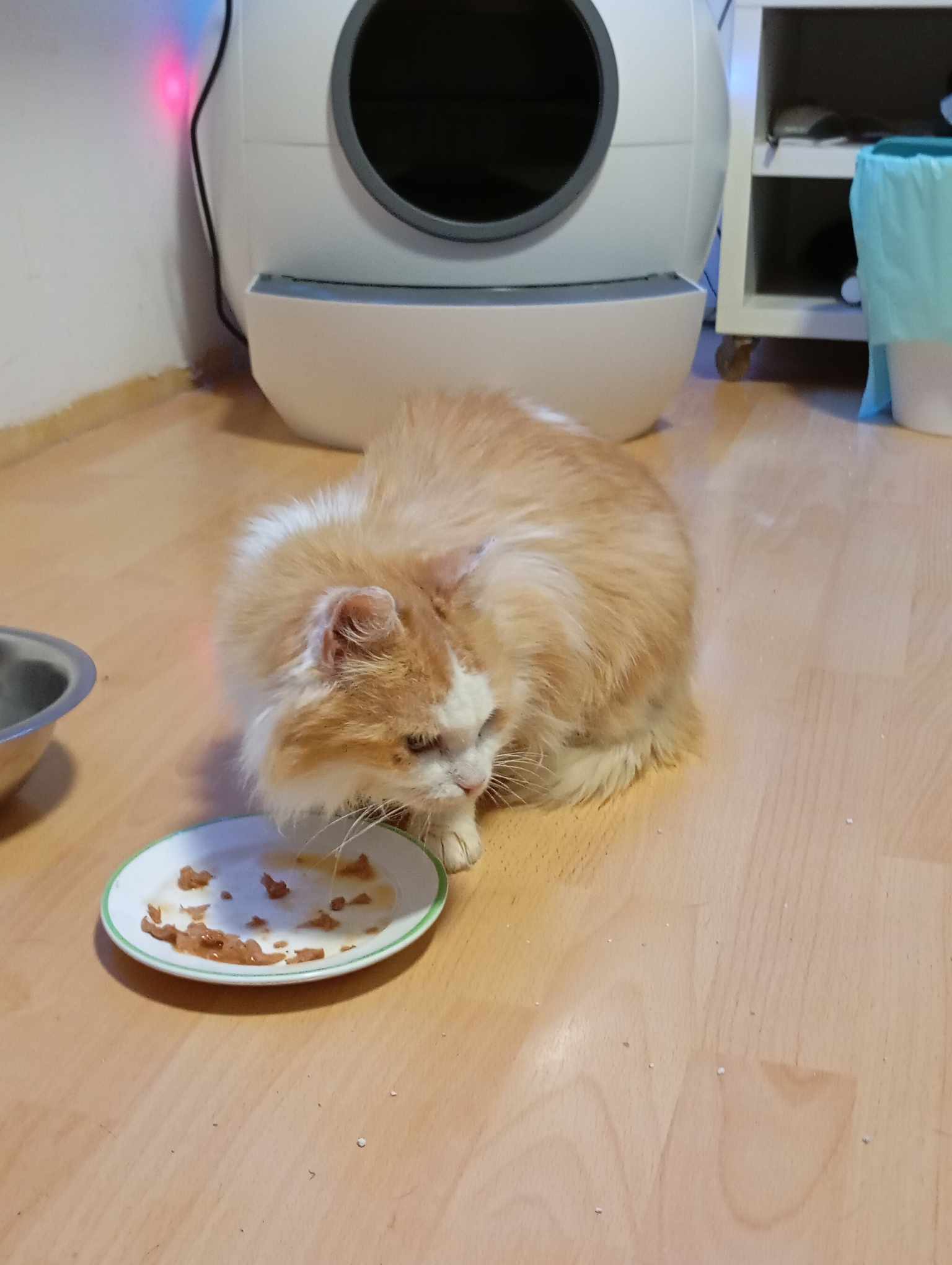 „Zdravím, Zrzečka dostala od dcery nový chytrý záchod, no to bude zajímavé 🤔,jinak přibrala na váze a roste nová srst🤗, dneska byla na mě dost naštvaná – bylo koupání protože jinak jsme taková šmudlina , hlavně vadí písek v záchodě to budu muset vyřešit abych vybrala co neprasi protože v její srsti zejména tlapky a spodek jsou vždy špinavé a ona to nestačí si vyčistit.