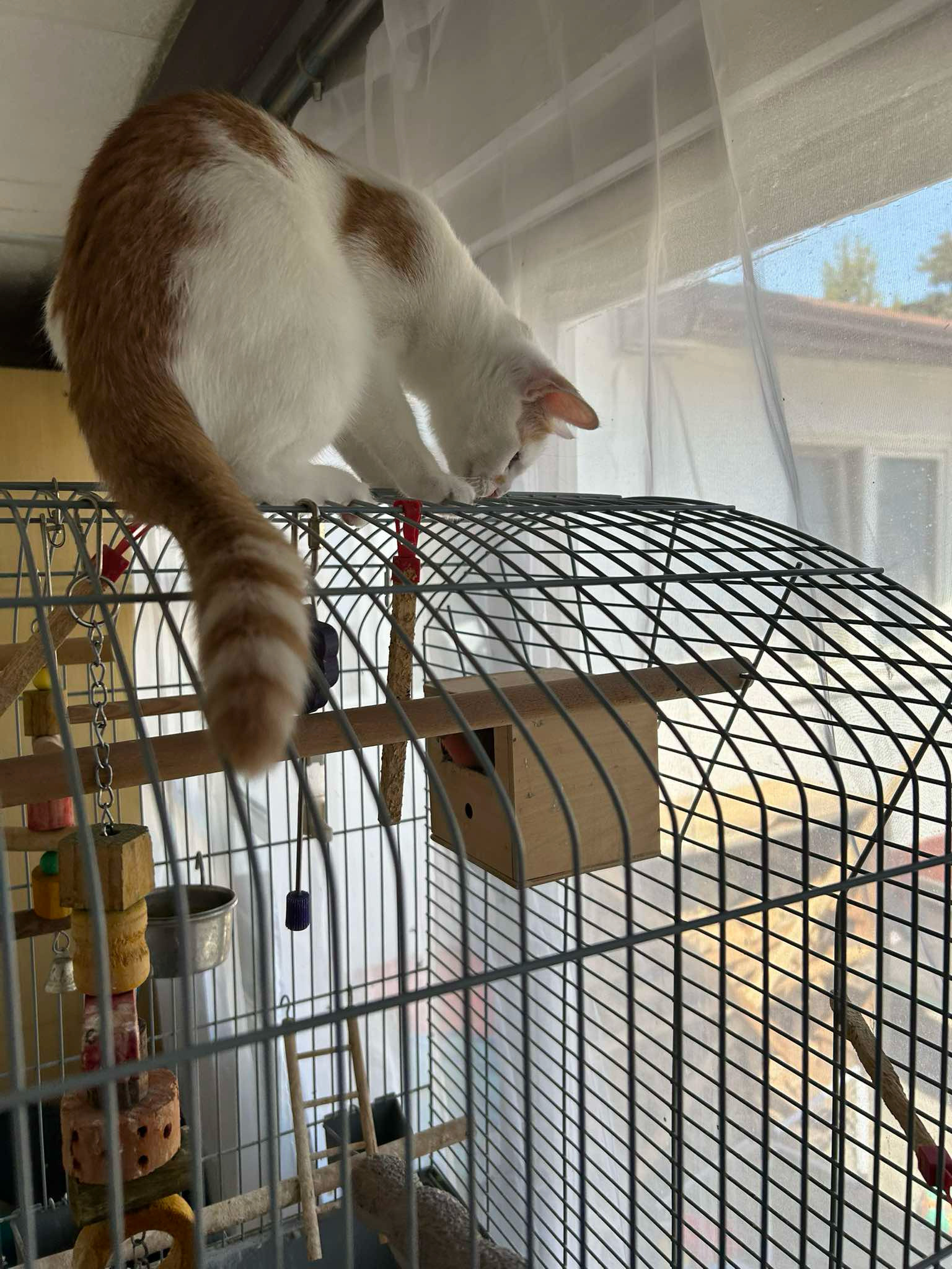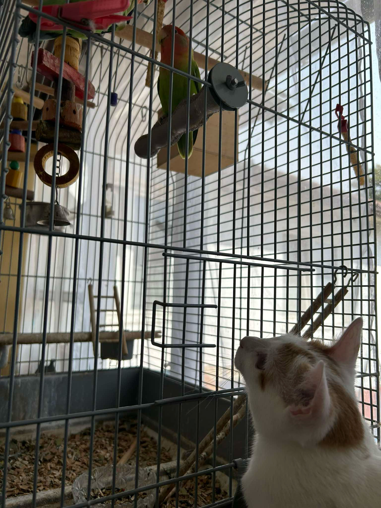 Jak se časem víc otrkala, tak si všimla že máme na chodbě malé papoušky. Tak buď chce být s nimi kamarádka nebo čeká až někdo zapomene zavřít dvířka od klece… 😁
