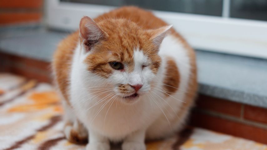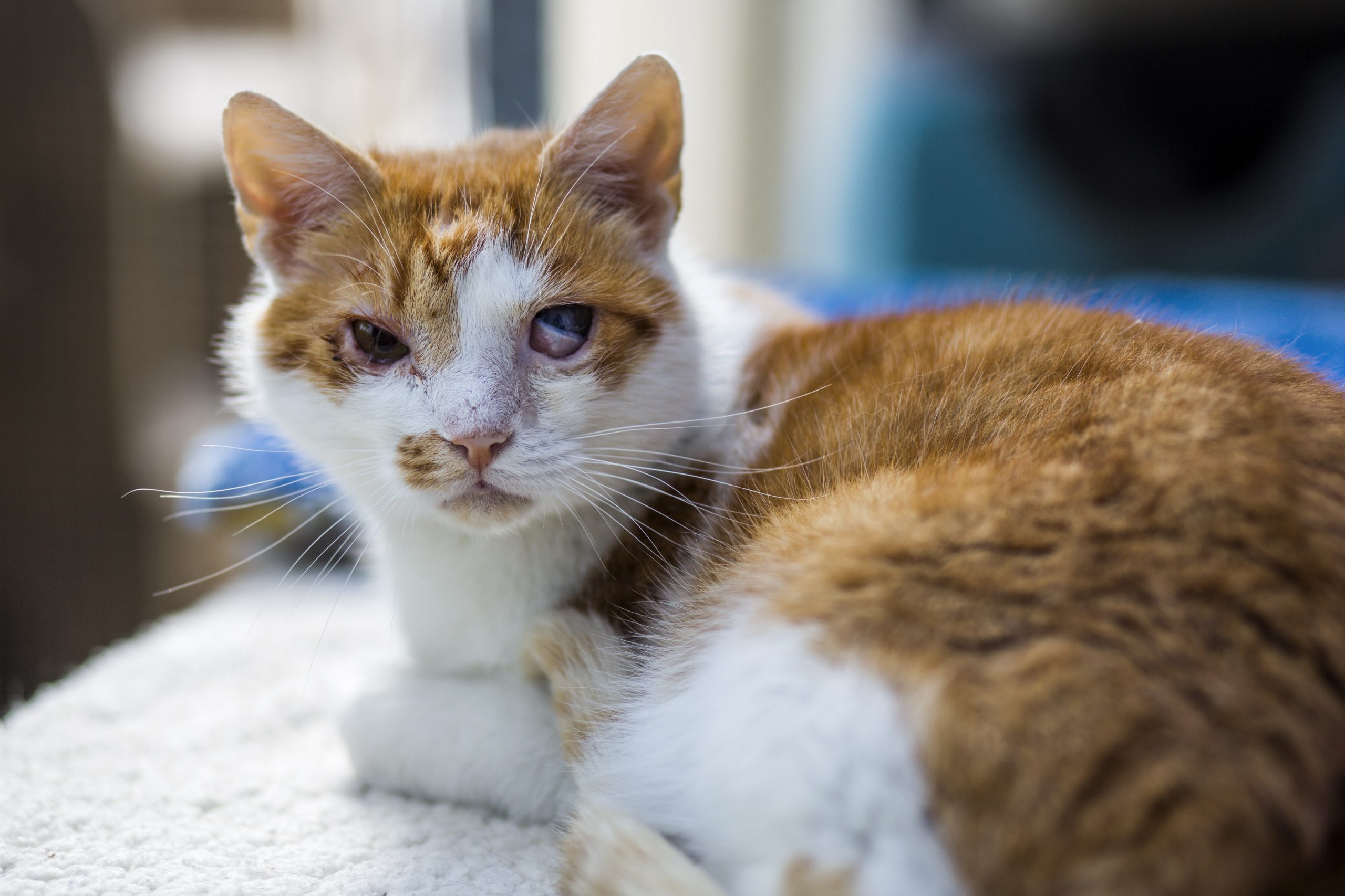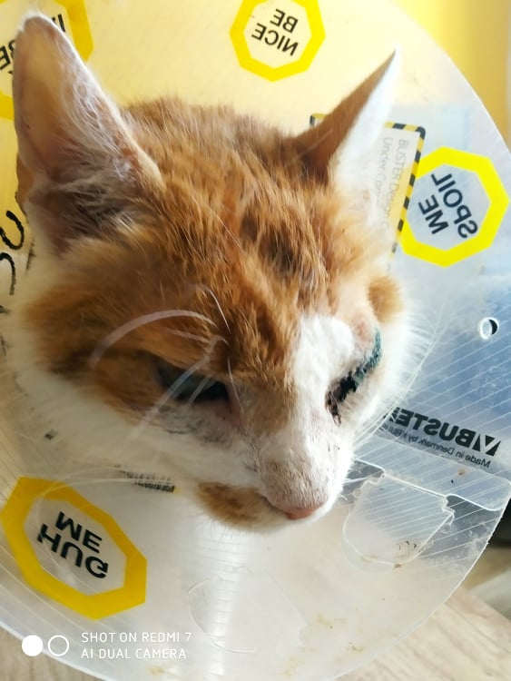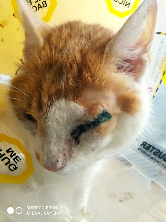 Kocourek byl nalezen ve velmi špatném zdravotním stavu s nemocnýma očima. Na jednom mu u lékaře zjistili rohovkový vřed, který praskl, oko se již nepodařilo zachránit a muselo být odstraněno.